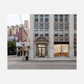 The showroom’s design integrates key architectural details and historic characteristics that recall Warren & Wetmore’s focus on Beaux-Arts classicism. Honoring the original design intent for the façade, and in homage to Maharam’s roots in New York (beginning in 1902 when Russian-immigrant Louis Maharam founded the business selling textile remnants from a pushcart on the Lower East Side), the company’s official registered name “Maharam Fabric Corp.” is mounted in bronze lettering over the entrance flanked by columns and capped with a decorative pediment. Expansive windows line the north-and-west facing walls and highlight the room’s exceptional height—a novelty at the time of its construction. Cantilevered granite slabs run along the windows and serve as interior perches that create visual continuity between interior and exterior environments. Plaster restoration preserves historic interior details, including egg-and-dart crown molding with acanthus leaf coffers. Herringbone parquet floors painted luminous gray nod to those of the original space.