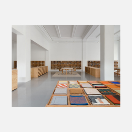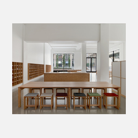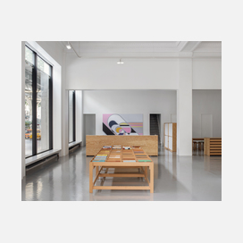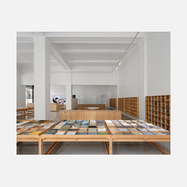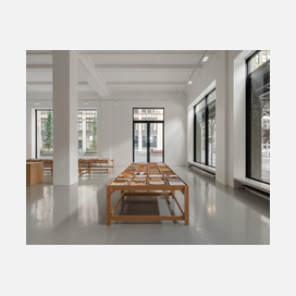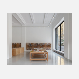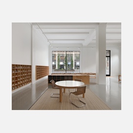 In keeping with Maharam interiors around the world, the new location features a reduced, gallery-like setting for optimal viewing of an extensive product library. Displays and furnishings made of solid fir and marine plywood provide warm, neutral counterpoints to textiles and leather. The showroom’s eastern wall previews The Conversation, Sarah Morris’ forthcoming contribution to Maharam Digital Projects—a series of digitally printed, large-scale wall installations. Echoing gridded features throughout the space, recessed wooden shelving systems serve as wall-mounted sample libraries. Partitioned tabletops display products in Mondrian-like fields of color, pattern, and texture, and leather-wrapped door handles provide a tactile invitation upon entry.